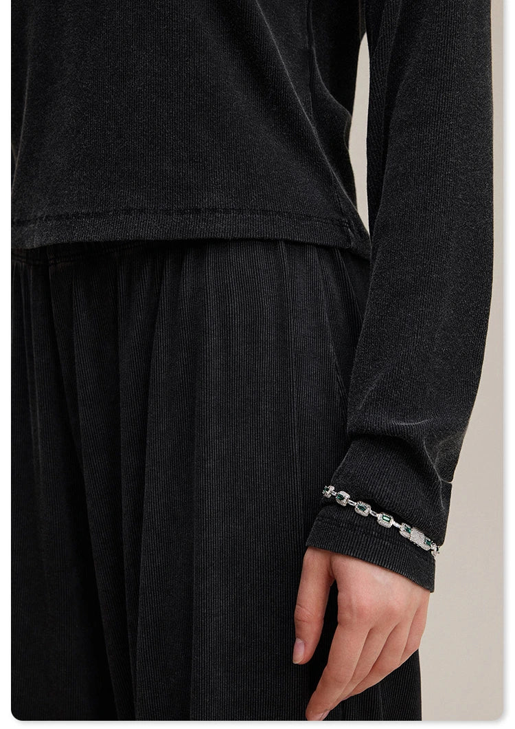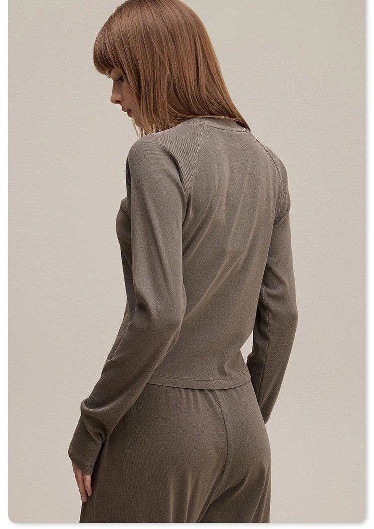 Long-sleeve crewneck top with a clean, minimal silhouette. Crafted from 275gsm cotton-rayon blend with added spandex for stretch, giving it a soft yet structured drape.